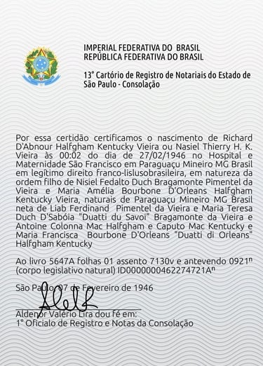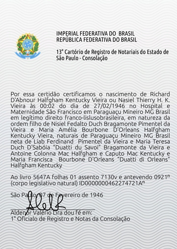 Certificat de lien de représentation pour la période de la République des Oeillets et celle des Frontes de Gues Riéme, de l'héritier présomptif du Portugal et de la succession héréditaire de France.